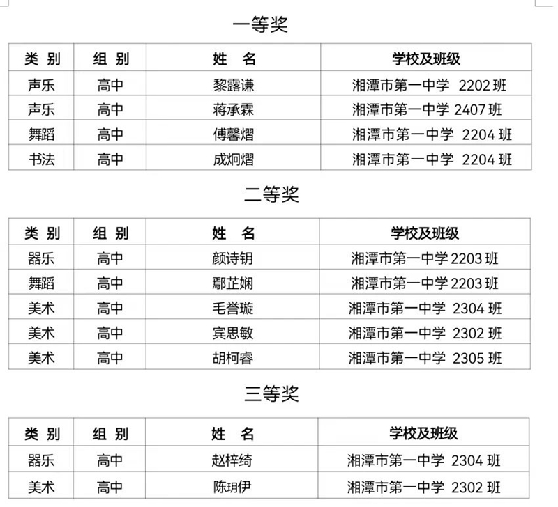 在湘潭市第24屆中小學生“藝術百佳”暨省“三獨”比賽參賽選手評選活動中,我校黎露謙、傅馨熠、蔣承霖、成炯熠同學獲市一等獎,顏詩鑰、鄢芷嫻、毛譽璇、賓思敏、胡柯睿同學獲市二等獎,趙梓綺、陳玥伊同學獲市三等獎,劉江玉芬、劉文嵐老師被評為“優(yōu)秀指導教師”。特向全校師生報喜!