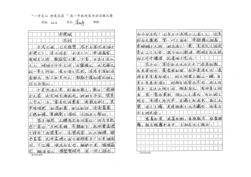 高一年級(jí)舉行硬筆書法過級(jí)比賽